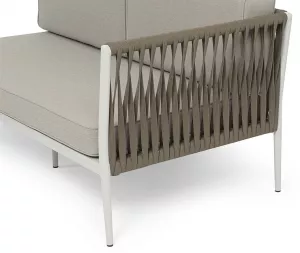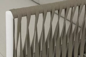 Диван имеет алюминиевый каркас, окрашенный порошковой краской в светло-серый (RAL7035) цвет. Боковины каркаса вручную оплетены плоским роупом - эластичными синтетическими лентами, изготовленными из высокопрочных полиэфирных волокон. Цвет оплетки - серо-коричневый.