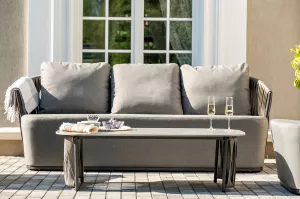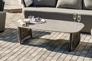 Журнальный столик выполнен из алюминия, окрашенного износостойкой краской графитового цвета. Столешница - овальная, выполнена из искусственного камня графитового цвета.