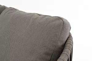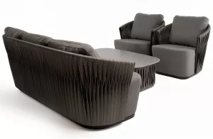 Плетеная мебель дополнена удобными подушками в графитовых чехлах. При их изготовлении используют полиэстер, плотность 300гр/м2. Он обрабатывается влагоотталкивающей пропиткой для повышения защитных свойств материала.