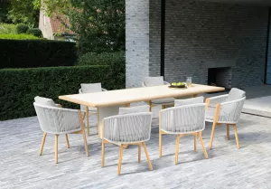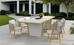Обеденные столы имеют керамическую столешницу толщиной 6мм с краями из цельного тика, вес стола- 67,5кг. Алюминиевый каркас спинки сиденья кресла, ножки из тикового дерева FSC + олефиновая веревка, подушка с наполнителем из пенополиуретана, солнцезащитная ткань.