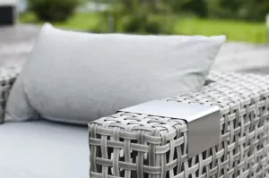 Подлокотники плетеного дивана и кресел оснащены алюминиевыми подставками, на которые можно поставить бокал или тарелку.