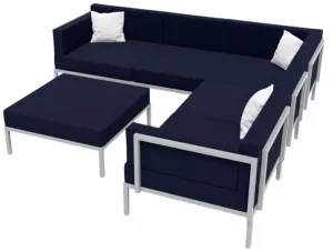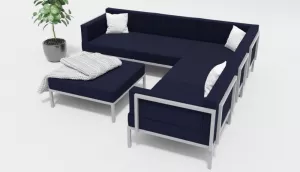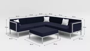 Материалы и цвета: каркас мебели выполнен из всесезонного алюминия с порошковым покрытием серебристого цвета, подушки спинок и сидений обшиты уличной тканью темно-синего цвета (А13813) с водоотталкивающей пропиткой, толщина подушек 12 см.