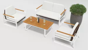 Материалы и цвета: каркас мебели выполнен из всесезонного алюминия с порошковым покрытием белого цвета, основа для сидений сделана из искусственного ротанга темно-коричневого цвета, подушки спинок и сидений обшиты уличной тканью белого цвета (А14814) с водоотталкивающей пропиткой, толщина подушек 6 см, столешница кофейного столика и подлокотники мебели изготовлены из тика.