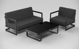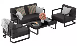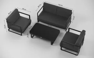Материалы и цвета: каркас мебели выполнен из всесезонного алюминия с порошковым покрытием темно-серого цвета (карбон), подушки спинок и сидений обшиты уличной тканью темно-серого цвета (А13805) с водоотталкивающей пропиткой, толщина подушек 12 см, столешница кофейного столика глянцевая, изготовлена из закаленного стекла толщиной 5 мм с нанесением черного цвета с помощью шелкотрафаретной печати.