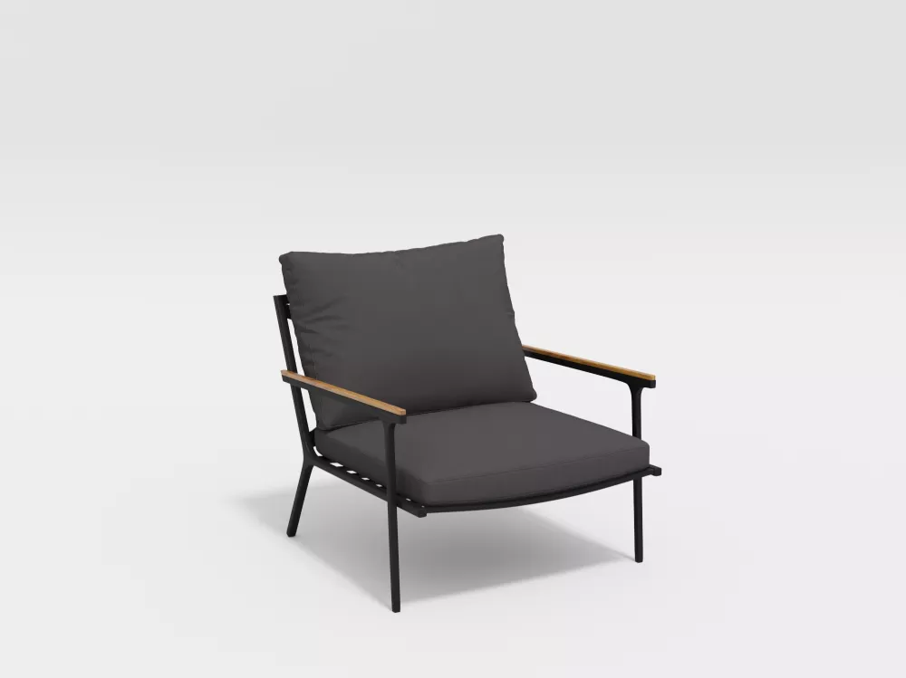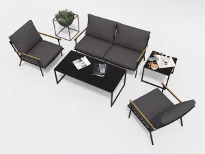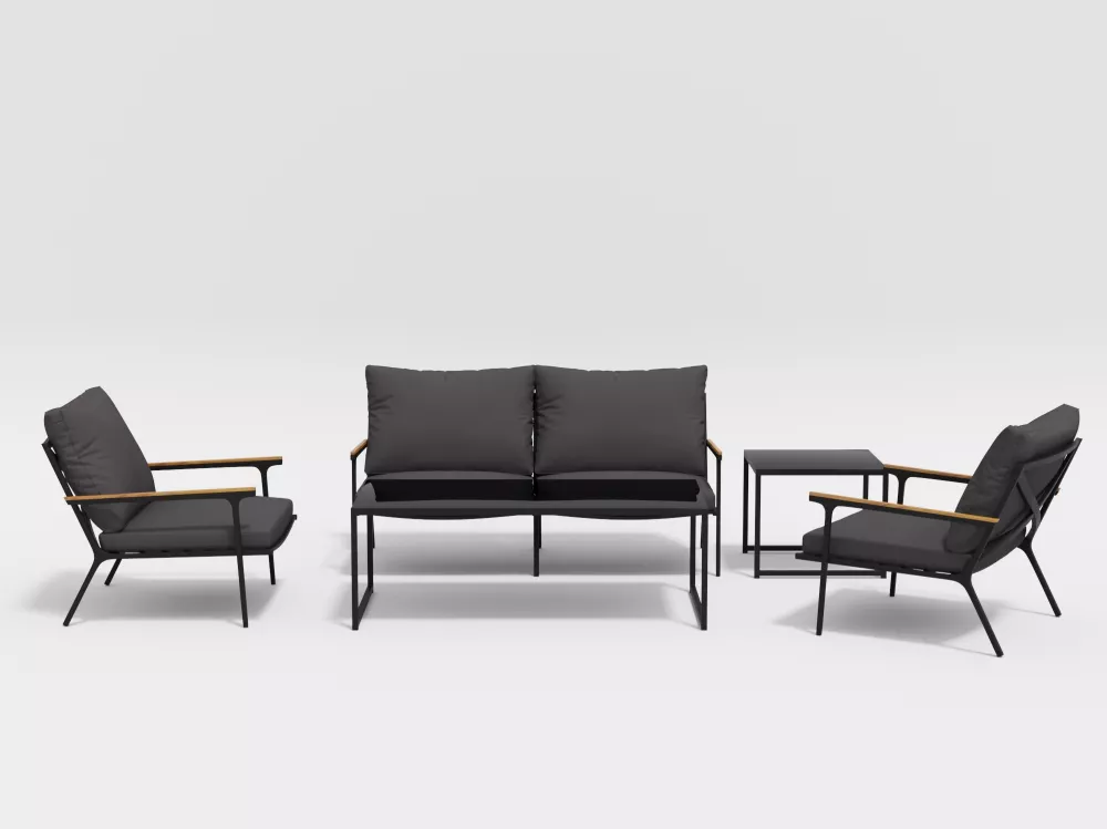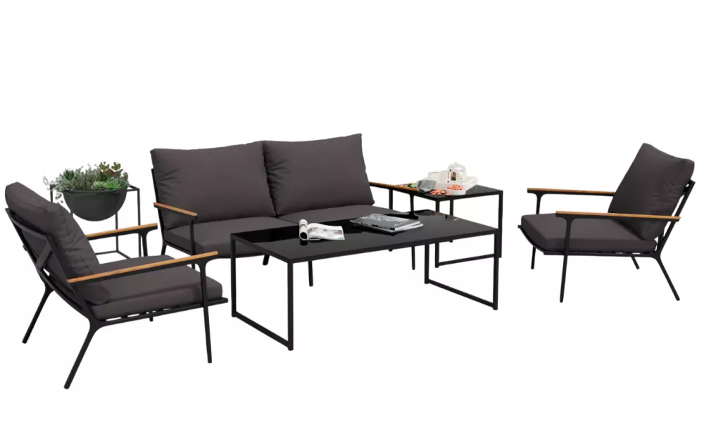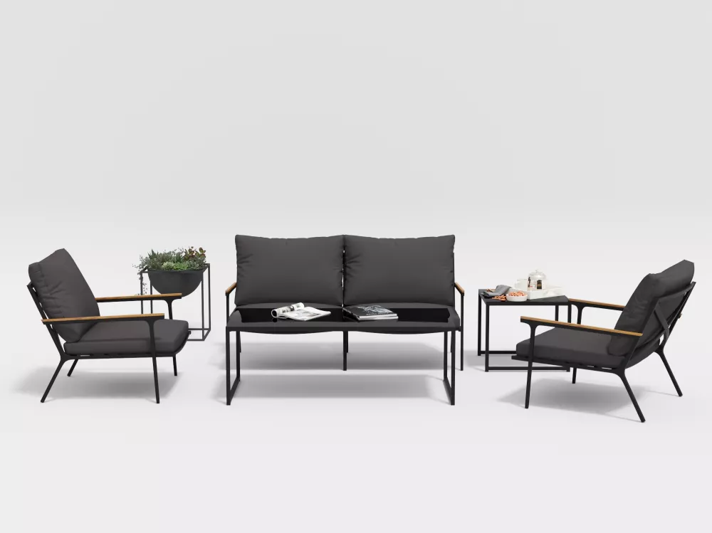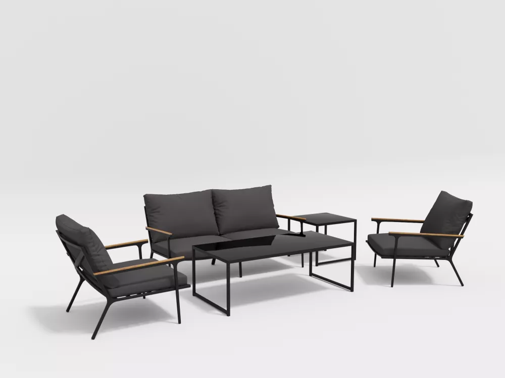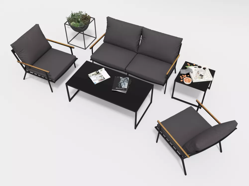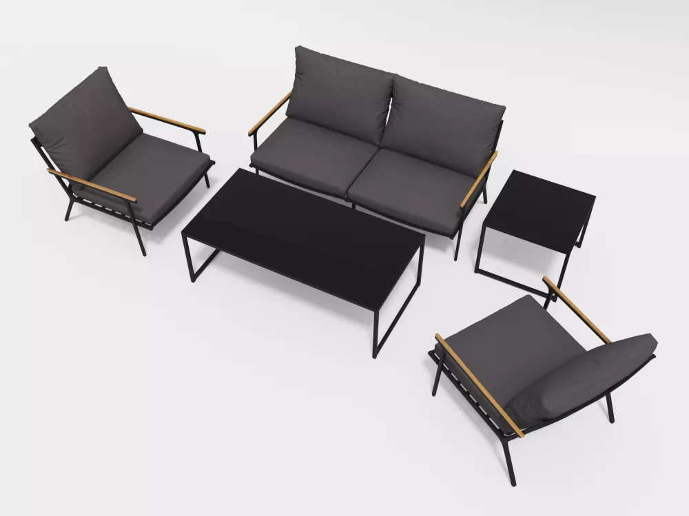 Материалы и цвета: каркас мебели выполнен из всесезонного алюминия с порошковым покрытием темно-серого цвета (карбон), подлокотники кресел и дивана декорированы вставками из тика, подушки спинок и сидений обшиты уличной тканью темно-серого цвета (А13805) с водоотталкивающей пропиткой, толщина подушек сидений 10 см, столешница кофейного и журнального столиков глянцевая, изготовлена из закаленного стекла толщиной 5 мм с нанесением черного цвета с помощью шелкотрафаретной печати.