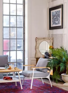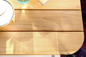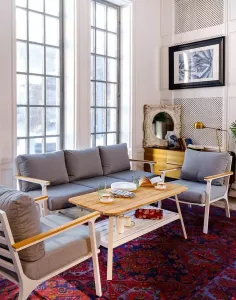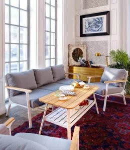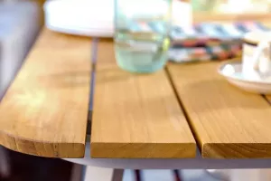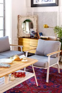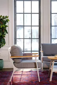 Комбинация каркаса матового белого цвета с подлокотниками из натурального тика и спокойного тона глубоких и удобных подушек дает запоминающийся комплект садовой мебели, который займет достойное место на любой веранде.