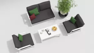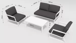 Материалы и цвета: каркас мебели выполнен из всесезонного алюминия с порошковым покрытием белого цвета, подушки спинок и сидений обшиты уличной тканью темно-серого цвета (А13805) с водоотталкивающей пропиткой, толщина подушек 12 см, столешница кофейного столика глянцевая, изготовлена из закаленного стекла толщиной 5 мм с нанесением белого цвета с помощью шелкотрафаретной печати.