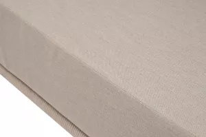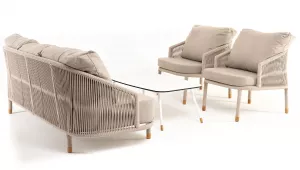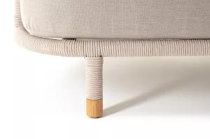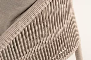 Каркас уличной мебели выполнен из износостойкого алюминия. Его дополняет бежевая ручная оплетка, изготовленная на основе эластичных синтетических лент из полиэфирных волокон высокой прочности (роупа).