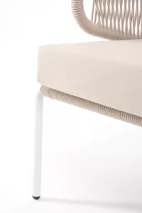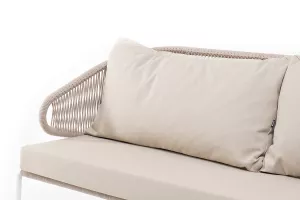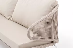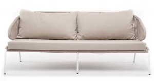 Диван имеет алюминиевый каркас, окрашенный порошковой краской в белый цвет. Боковины каркаса и спинка вручную оплетены роупом - эластичными синтетическими лентами, изготовленными из высокопрочных полиэфирных волокон. Цвет оплетки бежевый.