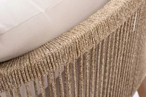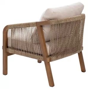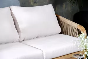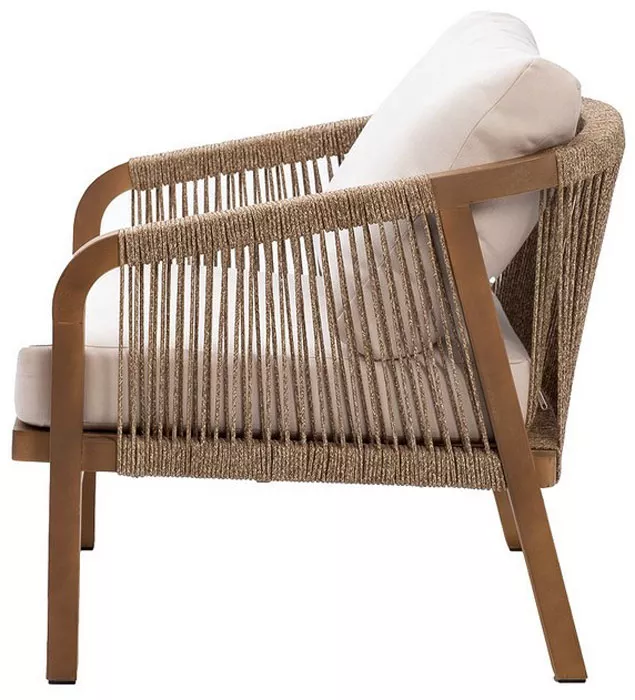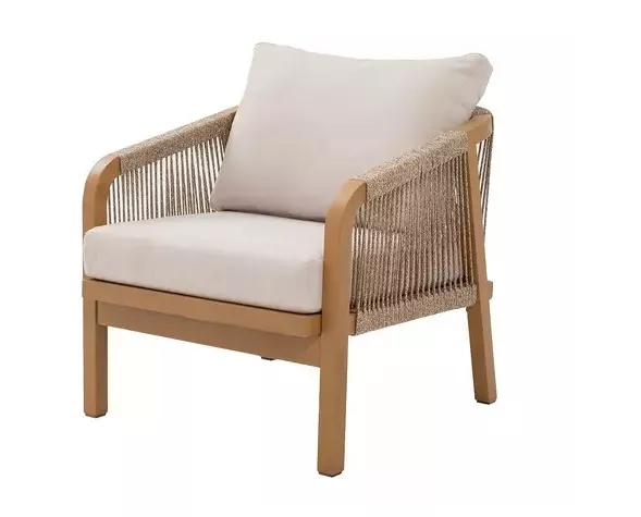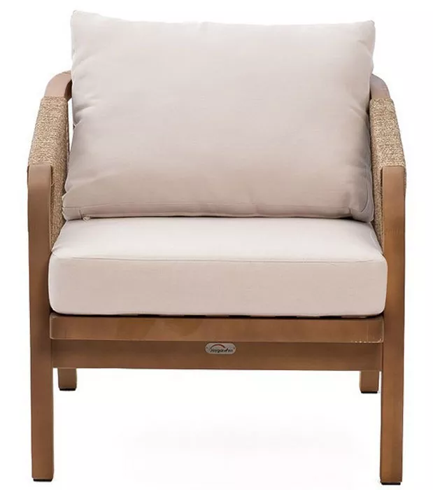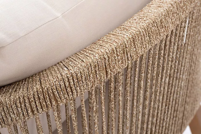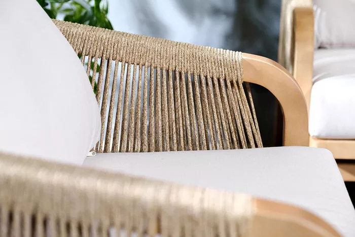 Современная коллекция садовой мебели из акации, выполненная в комбинации натурального веревочного плетения rope, массива акации и бежевых подушек.