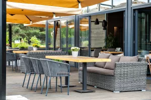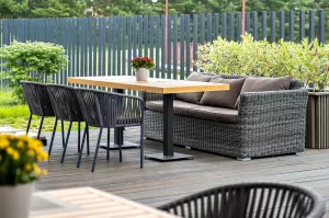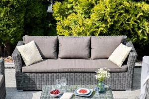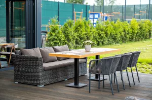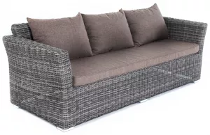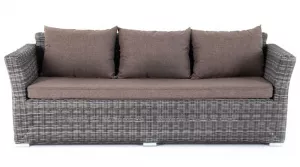 Диван из искусственного ротанга в своей основе имеет каркас из алюминия, который оплетен вручную круглым плетением графитового цвета.