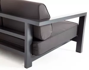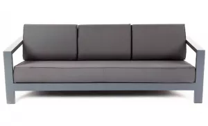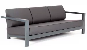 Стильный трехместный диван для обустройства зоны отдыха на балконе, в кафе или летней веранде. Каркас изготовлен из высокопрочного алюминия темно-серого цвета.