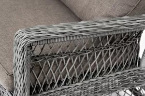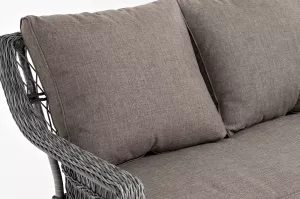 Модель выполнена с помощью ручного круглого плетения из искусственного ротанга. Трехместный диван представлен в графитовом цвете.