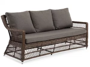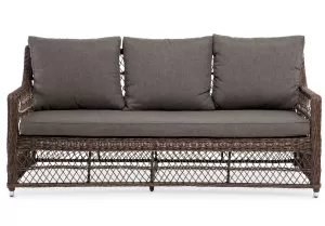 Модель выполнена с помощью ручного круглого плетения из искусственного ротанга. Трехместный диван представлен в коричневом цвете.