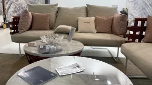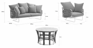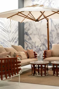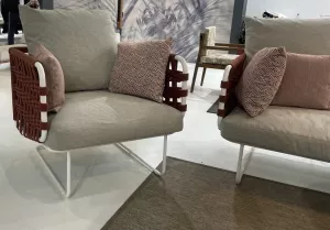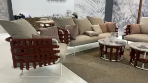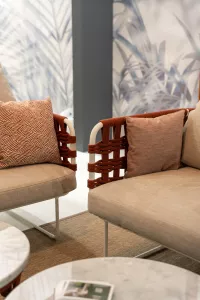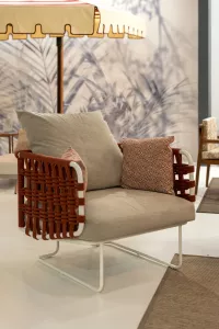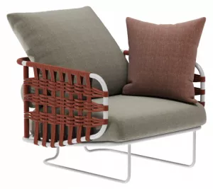 Коллекция с ее насыщенными тонами встречает гостей беспрецедентной универсальностью: она идеально подходит как для светских мероприятий, так и для приватного отдыха. Баланс форм и объемов адаптируется ко всем различным пространствам, от домашних террас до элегантных и изысканных открытых площадок отелей и крупных заведений. Уникальная переплетающаяся веревочная система, являющаяся легким мотивом всей коллекции, обеспечивает крепкую плетеную спинку диванов и кресел. Мягкие подушки, чередующиеся однотонными цветами с геометрическими узорами, создают удобные поверхности для сидения. Металлические конструкции переплетаются с тканевыми веревками, создавая расслабляющее гнездышко на открытом воздухе. Ансамбль необходимых и тщательно продуманных форм, которые придают любому открытому пространству ощущение гостеприимства и уюта.