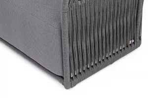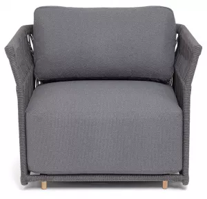 Кресло имеет алюминиевый каркас, окрашенный порошковой краской в темно-серый (RAL7024) цвет. Боковины каркаса и спинка вручную оплетены роупом - эластичными синтетическими лентами, изготовленными из высокопрочных полиэфирных волокон. Цвет оплетки в тон каркасу - темно-серый. На ножках кресла идут дубовые наконечники (заглушки).