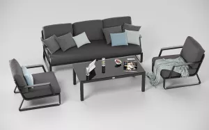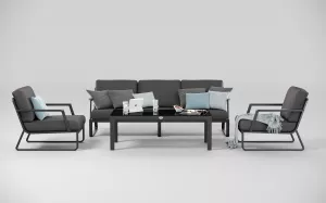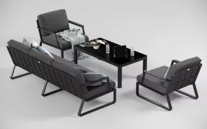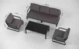 Материалы и цвета: каркас мебели выполнен из всесезонного алюминия с порошковым покрытием темно - серого цвета (карбон), подушки спинок и сидений обшиты уличной тканью темно - серого цвета (A 13805) с водоотталкивающей пропиткой, толщина подушек 12 см, столешница кофейного столика глянцевая, изготовлена из закаленного стекла толщиной 5 мм с нанесением черного цвета с помощью шелкотрафаретной печати.