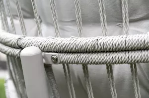 Каркас изготовлен из стали, окрашенного порошковой износостойкой краской белого цвета. Оплетка плоский искусственный ротанг светло-серого оттенка. Материал устойчив к перепадам погоды и подходит для использования на открытых пространствах.