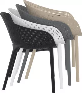 Пластиковые кресла серии с перфорированными сиденьем и спинкой станут отличным выбором для обстановки фуд-кортов, кафе, ресторанов и баров. Благодаря использованию высококачественных материалов, они долгое время не теряют своего привлекательного внешнего вида, даже несмотря на активную эксплуатацию. Отсутствие металлического каркаса и устойчивость к ультрафиолетовому воздействию обеспечивают использование пластиковых кресел на открытых площадках.