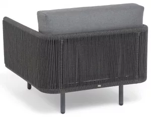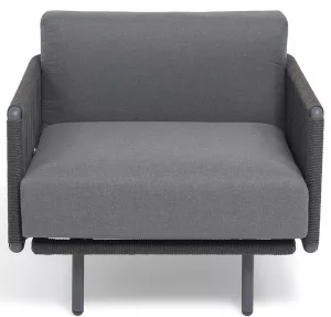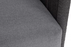 Каркас изготовлен из алюминия и покрыт порошковой краской темно-серого цвета (RAL7024), что повышает устойчивость к атмосферным воздействиям. Боковины каркаса вручную оплетены роупом эластичными синтетическими лентами, выполненными из прочных полиэфирных волокон.
