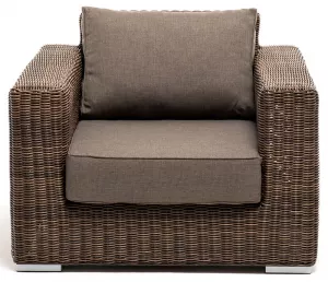 Кресло оснащено каркасом из прочного алюминия, ручное круглое плетение является основным декоративным элементом мебели. Оно выполнено из искусственного ротанга в коричневом цвете.