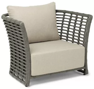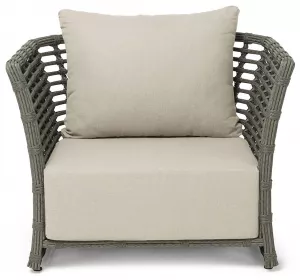 Кресло оснащено каркасом из прочного алюминия, ручное круглое плетение является основным декоративным элементом мебели. Оно выполнено из искусственного ротанга в сером цвете.