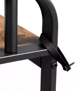 Металлические трубы с матовой поверхностью и ДСП в винтажном стиле делают скамейку для обуви прочной и устойчивой; деревянная полка выдерживает нагрузку до 80 кг.