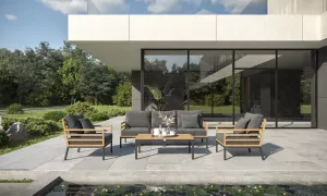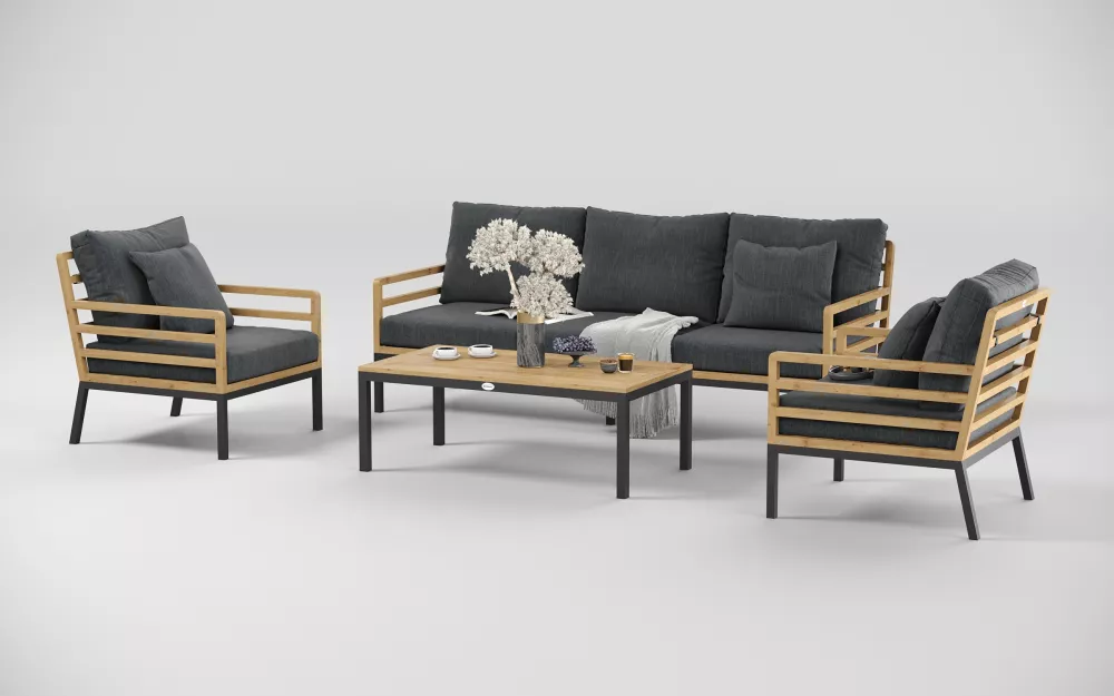 Материалы и цвета: каркас дивана и кресел изготовлен из тика, подножье выполнено из всесезонного, долговечного алюминия с порошковым покрытием темно - серого цвета (карбон), подушки спинки и сидений обшиты премиальная уличной тканью темно - серого цвета. Ткань устойчива к ультрафиолетовому излучению, водостойкая. Толщина подушек 12 см. Чехлы съемные. Каркас кофейного столика изготовлен из алюминия, столешница из тиковых планок