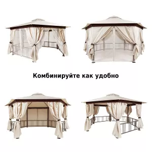 - Каркас: комбинированный алюминиевый/стальной каркас. 6 алюминиевых опор диаметром 100 мм и толщиной 1,0 мм, алюминиевая крыша из трубы 16х26х0,27 мм. 5 стальных ограждений из трубы 20х40х0,6 мм и 10х20х0,5 мм