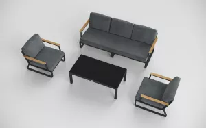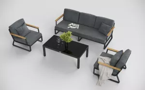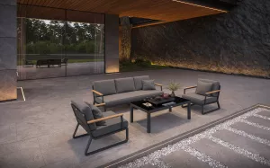 Материалы и цвета: каркас мебели выполнен из всесезонного, долговечного алюминия с порошковым покрытием темно - серого цвета (карбон), подлокотники дивана и кресел изготовлены из благородного тика, подушки спинок и сидений обшиты премиальной уличной тканью темно - серого цвета. Ткань устойчива к ультрафиолетовому излучению, водостойкая. Толщина подушек 12 см. Чехлы съемные. Столешница кофейного столика глянцевая, изготовлена из закаленного стекла толщиной 5 мм с нанесением черного цвета с помощью шелкотрафаретной печати.