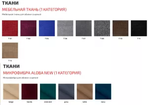 Кожзаменители «винилис» (в том числе черный к/з), Ткань цветная, ткань триплированная, ткань "Aloba New", ткань "Velutto".