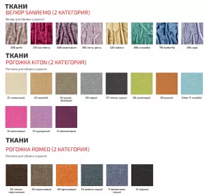 к/з "Santorini", к/з перфорированный, к/з "Oregon", к/з "Oregon Antik " (38, 40, 41, 42), Ткань "Dali", рогожка "Kiton", рогожка "Romeo", микрошенилл "Runa", букле "Melange", велюр с "краш" эффектом "Sanremo".