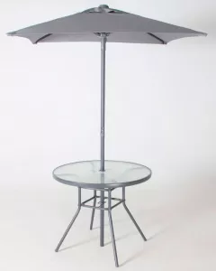 Набор мебели из 6-ти предметов. В комплект входит 4 стула (д*в*гл): 72 * 55 * 93 см., круглый стол (д*в): D86*71 см, зонт D1,5м. Стулья штабелируемые, стальные, Сечение профиля ножек: 36*14 мм размер стропильной трубки: 26*17 мм (цинковое покрытие) сидение из текстиля. Каркас зонта - сталь с порошковым покрытием, 4 стержня сечением: 10*6 мм, ткань:полиэстер плотностью 140г/м2. Каркас стола: сталь с порошковым покрытием, столешница из стекла с отверстием для зонта, сечение труб рамы стола: 34*15 мм, сечение трубы ножки: D24 мм.
