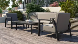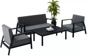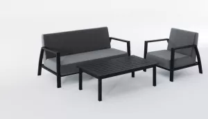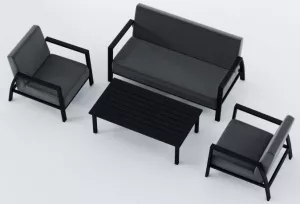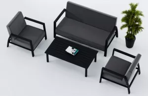Материалы и цвета: каркас мебели выполнен из всесезонного алюминия с порошковым покрытием темно-серого цвета (карбон), подушки спинок и сидений обшиты уникальной уличной тканью Sunbrella темно-серого цвета, не выгорающей на солнце, толщина подушек сидений 15 см, планки столешницы кофейного столика темно-серого цвета (карбон) изготовлены из прочного алюминия толщиной 10 мм.
