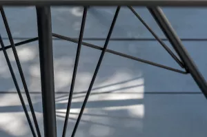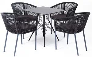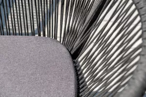 4 кресла выполненных из алюминиевого каркаса и ручной оплетки роупом. Это эластичные синтетические ленты из высокопрочных полиэфирных волокон, представлены в темно-сером цвете.