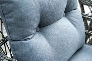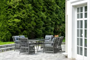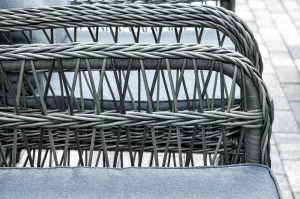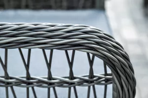 Вся мебель изготовлена из алюминия, вручную оплетенного круглым искусственным ротангом графитового оттенка. Столешница укомплектована ударопрочным стеклом, толщиной 5 мм. Данное стекло крепится к столу при помощи четырех вакуумных силиконовых присосок и поставляется в собранном виде.