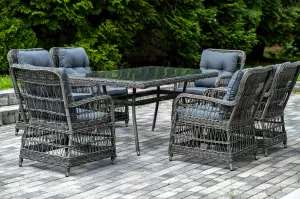 Садовая обеденная группа на 6 персон из ротанга. В комплекте: большой прямоугольный обеденный стол (1600Ч900Ч750 мм) и 6 кресел (600Ч800Ч910 мм).