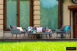 Пышные мягкие подушки создают атмосферу семейного уюта на веранде.