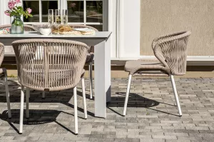 Плетеные стулья выполнены из роупа бежевого цвета, который гармонируют с общим дизайном комплекта. Размер каждого стула составляет 570Ч620Ч795 мм. Каркас из алюминия придает стульям легкость и прочность, а порошковое окрашивание защищает металл от коррозии и увеличивает срок службы мебели.
