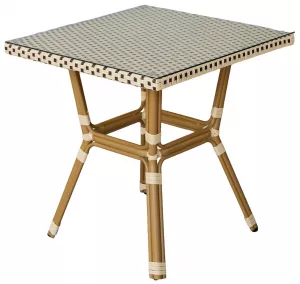 В набор входят квадратный стол и четыре стула, объединённые единым дизайнерским решением: изысканное ручное плетение из плоского искусственного ротанга в бежевокоричневой гамме эффектно дополняет прочный алюминиевый каркас с износостойким покрытием.