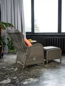 Комплект из 5-ти предметов из искусственного ротанга и алюминия / откидная спинка, подушка для сиденья толщиной 10 см, мягкая подушка для спины и декоративная подушка; регулируемая спинка с цилиндром; столик со стеклом