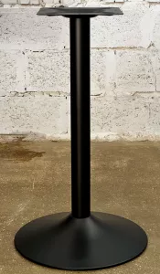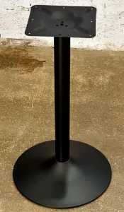 Черное матовое (порошковое напыление). Основание "рюмочкой". Диаметр основания: 60 см, диаметр трубы: 7,6 см, размер верхней площадки: 25х25 см. Рекомендуемый размер столешницы: D-90, 80х80. Характеристики