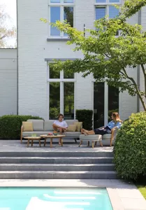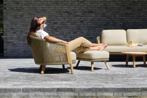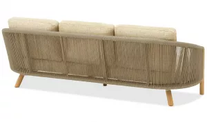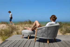 Алюминиевый каркас, ножки из тикового дерева FSC + олефиновая веревка, подушка с наполнителем из пенополиуретана, солнцезащитная ткань.