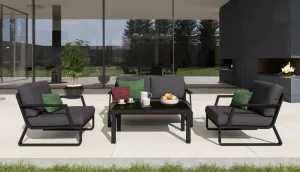 Материалы и цвета: каркас мебели выполнен из всесезонного алюминия с порошковым покрытием темно-серого цвета (карбон), подушки спинок и сидений обшиты уличной тканью темно-серого цвета (А13805) с водоотталкивающей пропиткой, толщина подушек 12 см, столешница кофейного столика глянцевая, изготовлена из закаленного стекла толщиной 5 мм с нанесением черного цвета с помощью шелкотрафаретной печати.