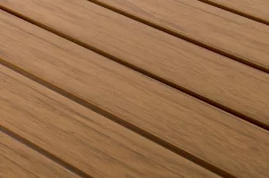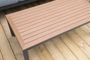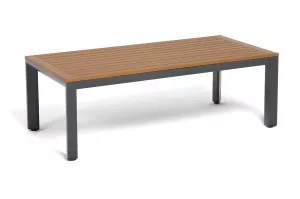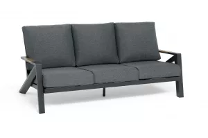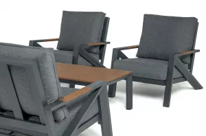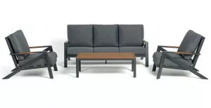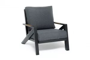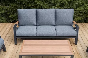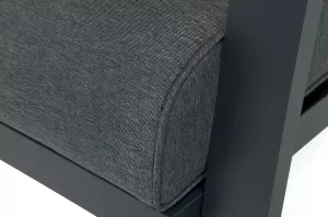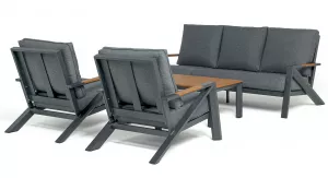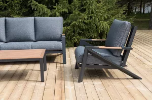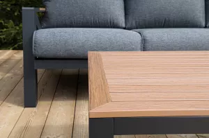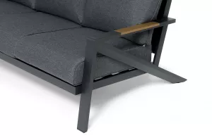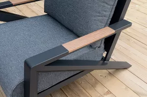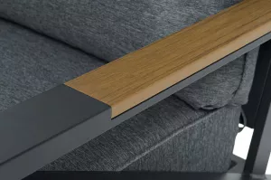 Каркас мебели выполнен из прочного алюминия темно-серого цвета. На подлокотниках дивана и двух кресел установлен облицовочный материал из древесно полимерного композита (ДПК) цвет «дерево». Крепление к каркасу осуществляется на болтах с пластиковыми заглушками темно-серого цвета, которые не ржавеют. Комплект дополняют подушки со съёмными чехлами. Материал чехлов - 100% полиэстер плотностью 190гр/м2.