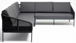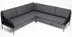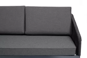 Диван имеет алюминиевый каркас, окрашенный порошковой краской в темно-серый (RAL7024) цвет. Боковины каркаса вручную оплетены роупом - эластичными синтетическими лентами, изготовленными из высокопрочных полиэфирных волокон. Цвет оплетки - темно-серый.