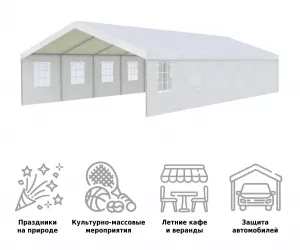 Шатер большой для мероприятия практичное и популярное решение для использования на даче, пикниках, шашлыках и кемпинге. Крыша тента защитит от солнца. Тент садовый быстро и несложно монтируется и закрепляется с помощью растяжек.