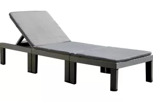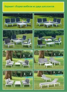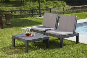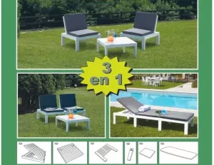 Многофункциональный складной шезлонг выполнен из пластика с имитацией структуры дерева. Размер шезлонга: 65x195x78 см. Вес изделия: 20,68 кг. Цвет шезлонга-антрацит. В комплект входят подушки: 4 подушки для модуля сидения + 1 подушка для шезлонга. Шезлонг может трансформироваться в 2 кресла и стол, (размер кресла:65х65х70 см, размер стола:65х65х32 см.), или 2-х местная софа и стол (размер софы: 130х65х70 см., размер стола: 65х65х32 см) Изготовлен из ударопрочного полипропилена, стойкого к воздействию окружающей среды. Материал: пластик. Максимальная нагрузка на каждое место 120 кг.