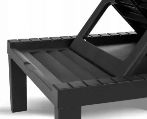 Размер шезлонга: 65x195x78 см. Выполнен из пластика с имитацией структуры дерева. Цвет шезлонга-антрацит, цвет подушки антрацит. Материал лежака высококачественный полипропилен, который имеет высокую прочность и устойчивость к разным погодным условиям. Подушка складывается. Регулировка спинки делает шезлонг удобным во время использования. Материал: пластик. Максимальная нагрузка 120 кг.