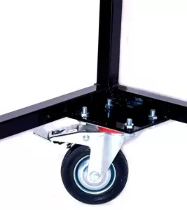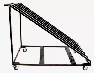 Каркас тележки изготавливается из профильной стальной трубы сечением 25х25 мм с толщиной стенки 1,5 мм и имеет складывающуюся конструкцию, что позволяет сэкономить место при хранении и снизить стоимость перевозки. Объём тележки разделен рамочными стойками на секции из расчёта размещения по два стола в каждой секции. Все детали каркаса соединены сваркой и окрашены порошковой полимерной краской. В нижней части каркаса по углам установлены 4 поворотные колесные опоры с диаметром колес 100 мм и ободами из литой резины; в двух опорах колеса снабжены тормозами для фиксирования тележки и предотвращения её самопроизвольного движения.